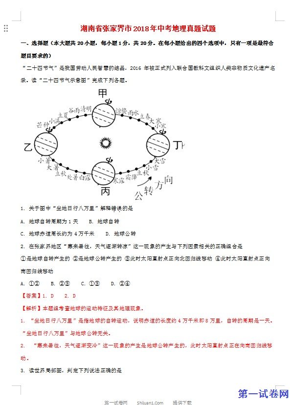 湖南省张家界市2018年中考地理真题试题(含解析)下载。试卷资源预览图如下: