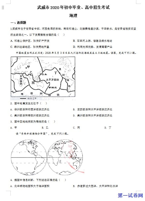 甘肃省武威市2020年中考地理试题(原卷版)下载。试卷资源预览图如下: