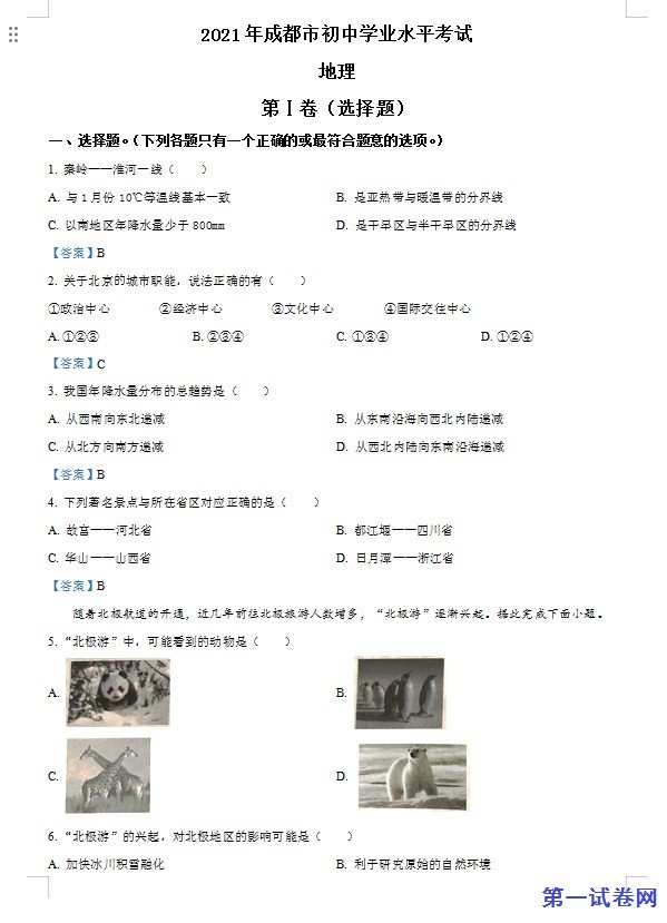 四川省成都市2021年中考地理真题及答案下载。试卷资源预览图如下: