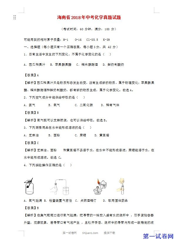 海南省2018年中考化学真题试题(含解析)下载。试卷资源预览图如下: