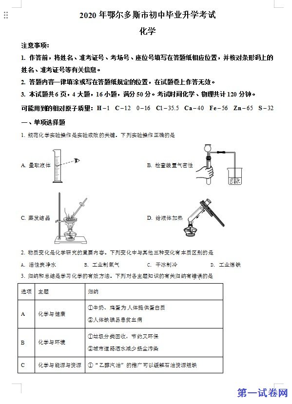 内蒙古鄂尔多斯市2020年中考化学试题(原卷版)下载。试卷资源预览图如下: