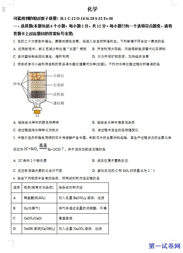 2023年内蒙古包头市中考化学真题(原卷版)下载。试卷资源预览图如下: