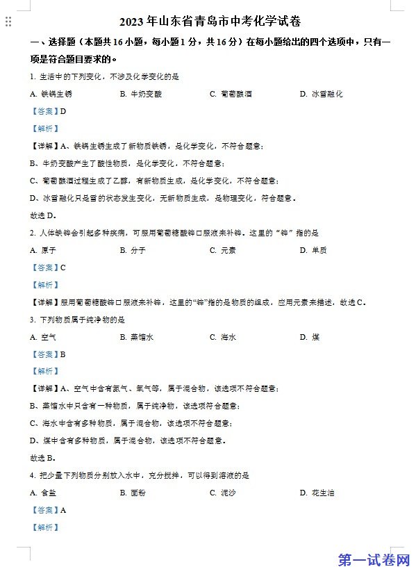 2023年山东省青岛市中考化学真题(解析版)下载。试卷资源预览图如下:
