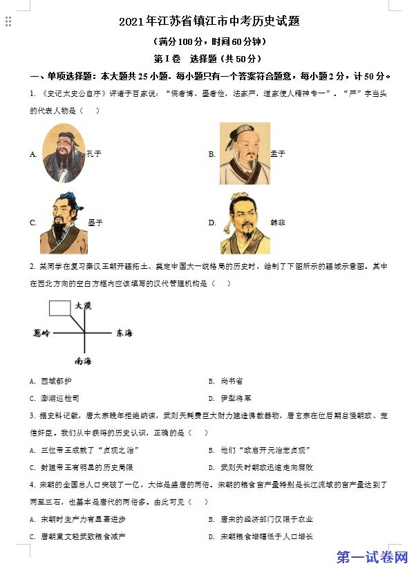 江苏省镇江市2021年中考历史试题(原卷版)下载。试卷资源预览图如下: