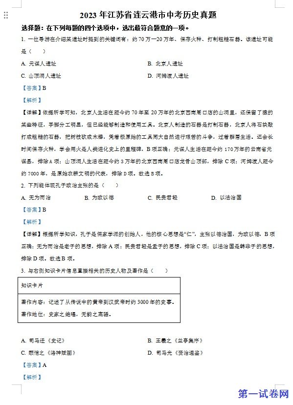 2023年江苏省连云港市中考历史真题(解析版)下载。试卷资源预览图如下: