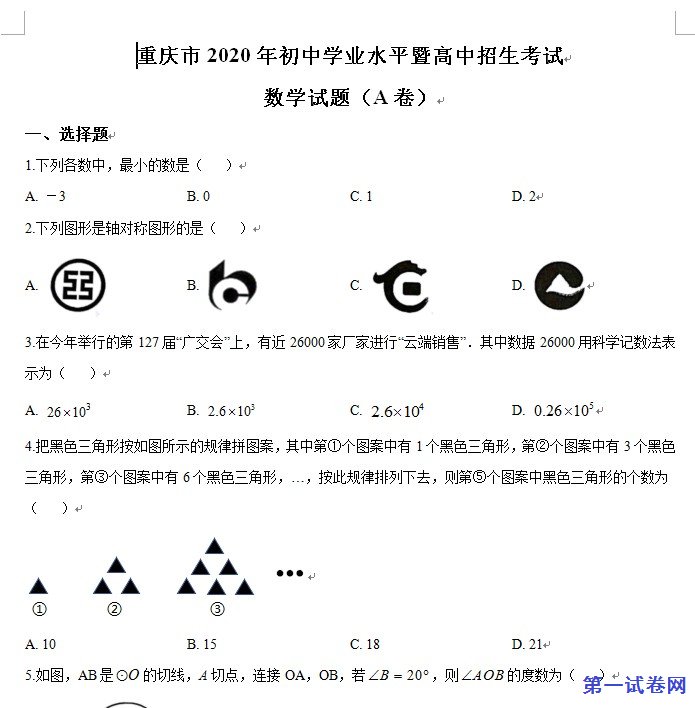 2020年重庆市中考数学试题A卷,第一试卷网收集整理。试卷有原卷版和解析版,都是Word文件,非扫描版本。下面是试卷的预览图: