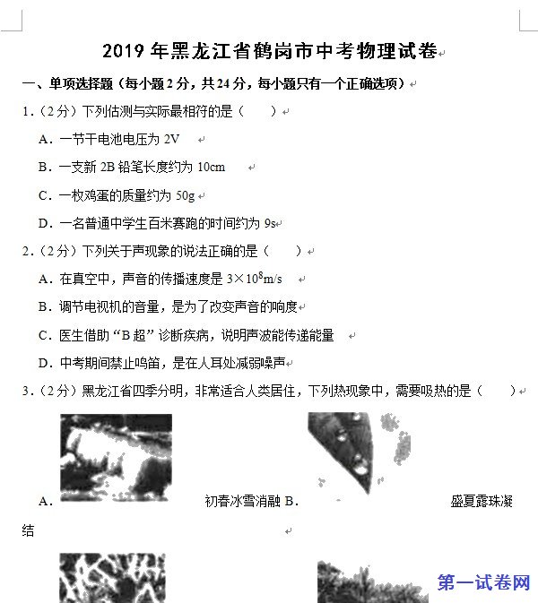 2019年黑龙江省鹤岗市中考物理试卷(word版 含答案),试题预览图如下: