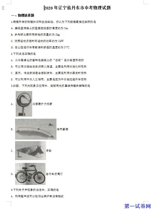 2020年辽宁省丹东市中考物理试题(原卷版)下载。试卷资源预览图如下:
