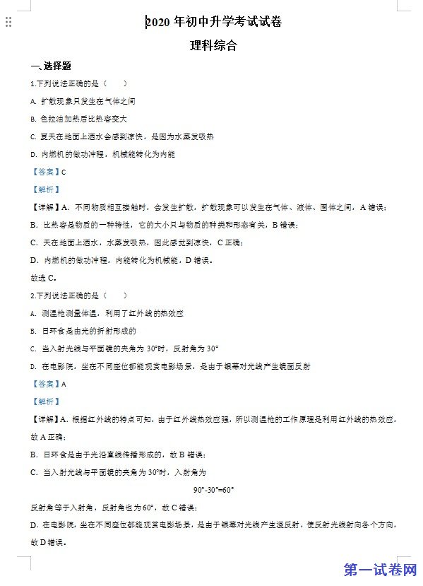 2020年内蒙古包头市中考物理试题(解析版)下载。试卷资源预览图如下: