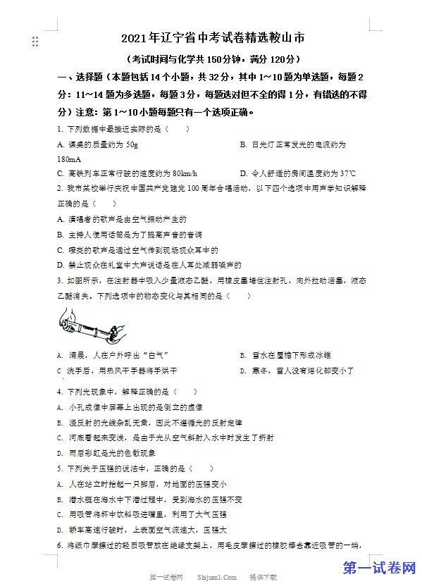 辽宁省鞍山市2021年中考物理试题(原卷版)下载。试卷资源预览图如下:
