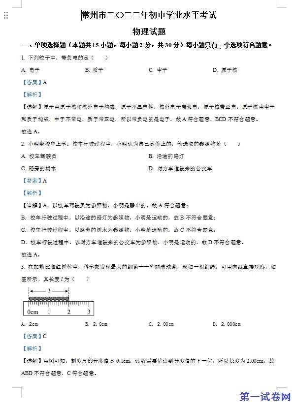 2022年江苏省常州市中考物理试题(解析版)下载。试卷资源预览图如下: