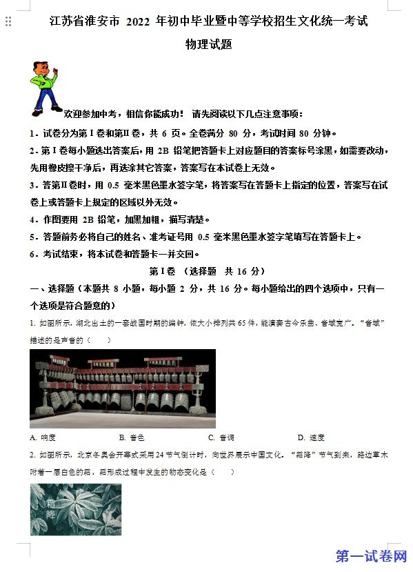 2022年江苏省淮安市中考物理试题(原卷版)下载。试卷资源预览图如下:
