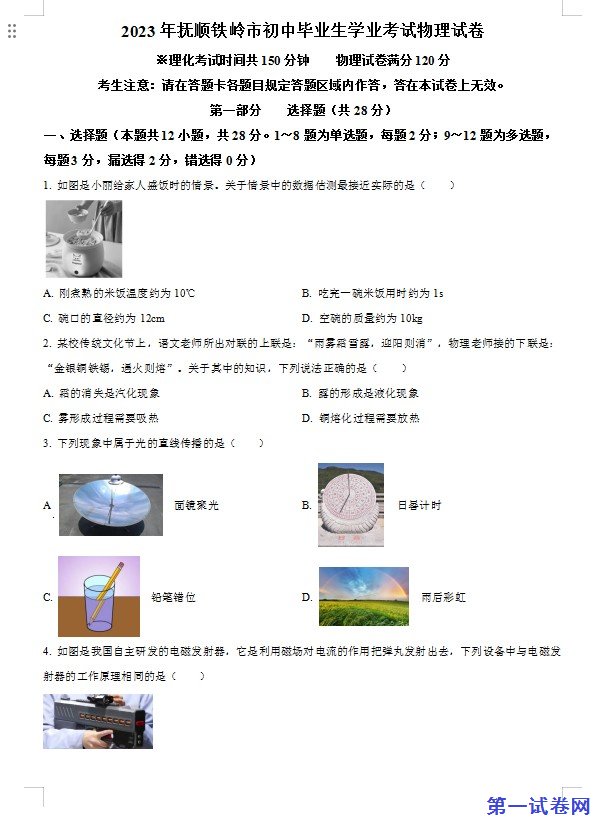2023年辽宁省抚顺铁岭中考物理真题(原卷版)下载。试卷资源预览图如下: