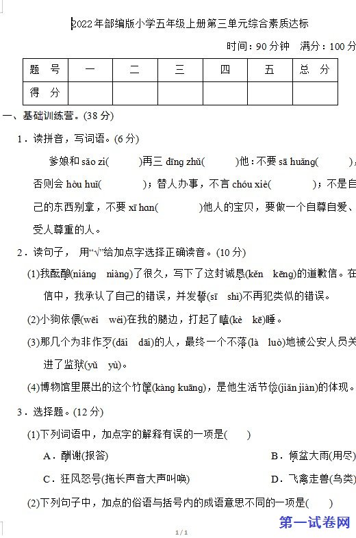 2022年部编版小学五年级上册第三单元综合素质达标