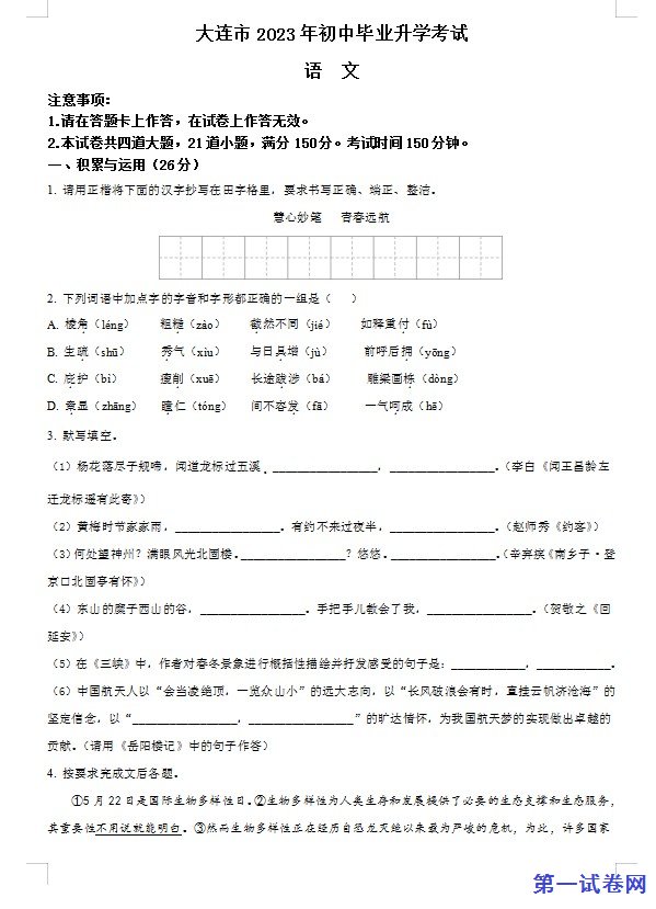 2023年辽宁省大连市中考语文真题(原卷版)下载。试卷资源预览图如下: