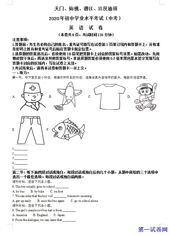 湖北省天门、仙桃、潜江、江汉油田2020年中考英语试题(原卷版)下载。试卷资源预览图如下: