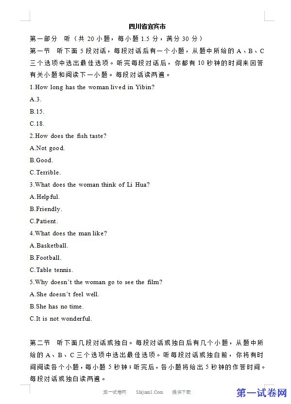 四川省宜宾市-2020年各地中考英语听力真题合集下载。试卷资源预览图如下: