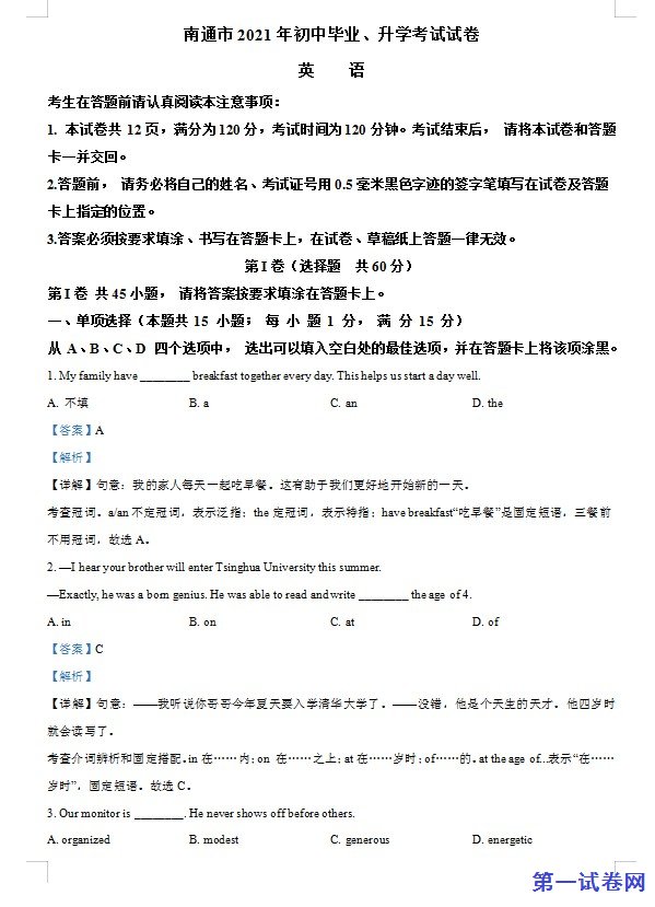 江苏省南通市2021年中考英语试题(解析版)下载。试卷资源预览图如下:
