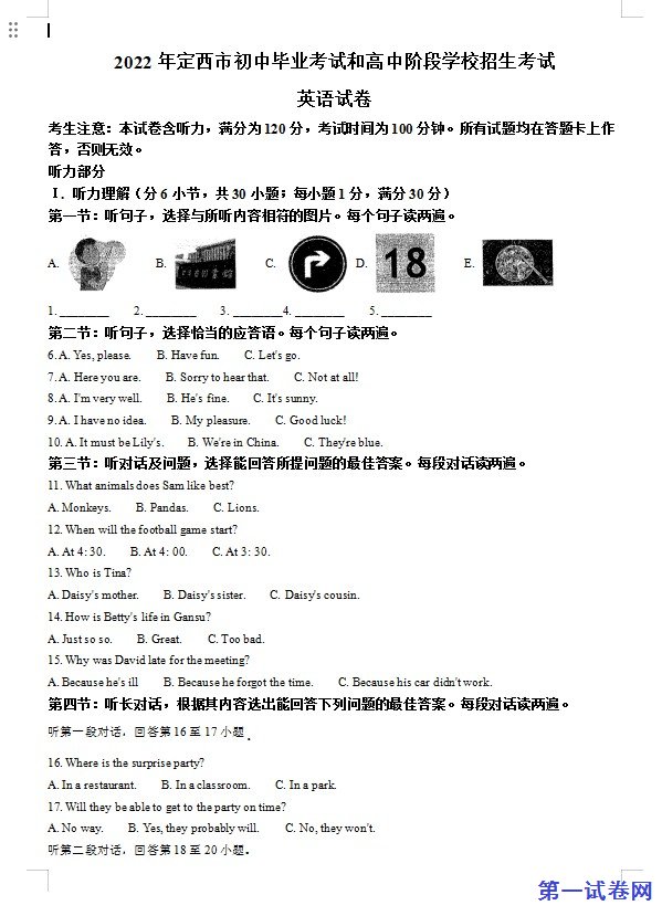 2022年甘肃省定西市中考英语真题(原卷版)下载。试卷资源预览图如下: