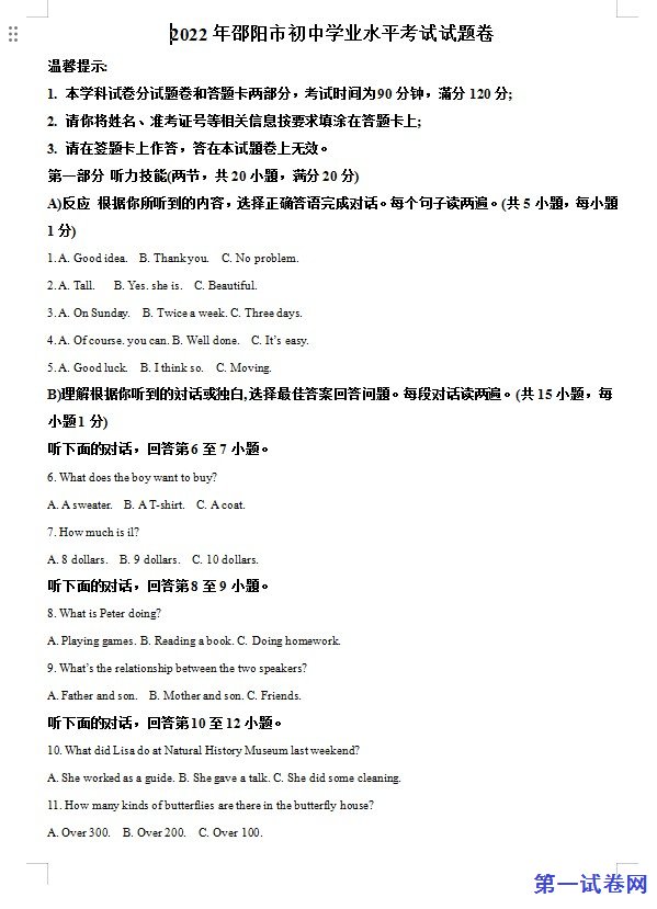 2022年湖南省邵阳市中考英语真题 (解析版)下载。试卷资源预览图如下:
