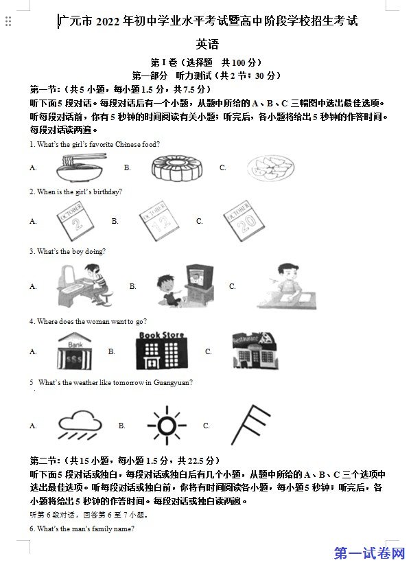 2022年四川省广元市中考英语真题(原卷版)下载。试卷资源预览图如下:
