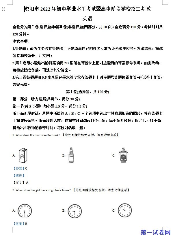 2022年四川省资阳市中考英语真题(含听力)(解析版)下载。试卷资源预览图如下: