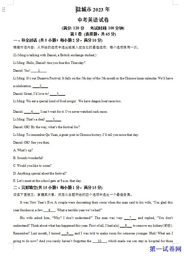 2023年江苏省盐城市中考英语真题 (原卷版)下载。试卷资源预览图如下: