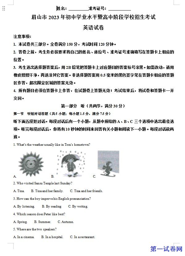2023年四川省眉山市中考英语真题(原卷版)下载。试卷资源预览图如下: